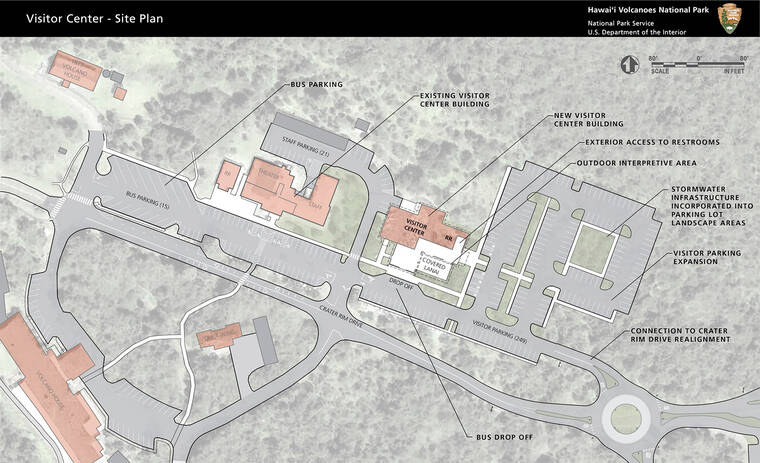 Map courtesy HVNP This map shows the proposed new visitor center for Hawaii Volcanoes National Park, as well as expanded parking area and proposed roundabout.