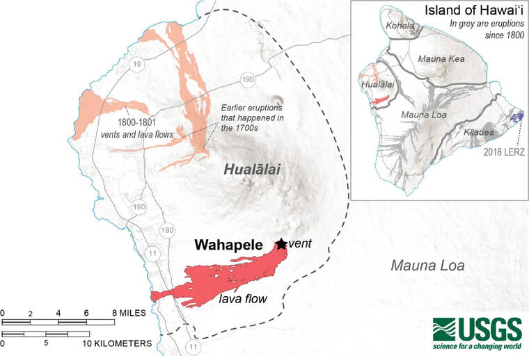 On land, the vent area and lava flows from the Wahapele eruption cover slightly more than Kilauea’s 2018 lower East Rift Zone eruption. It is about three-quarters the area of the 1800–1801 eruption, and is the third largest known for Hualalai in terms of area covered. A caveat: most older flows are at least partially covered by more recent flows, so we do not know their full extent — some flows may be much more extensive than their mapped extent, and could be bigger than the Wahapele eruption.
