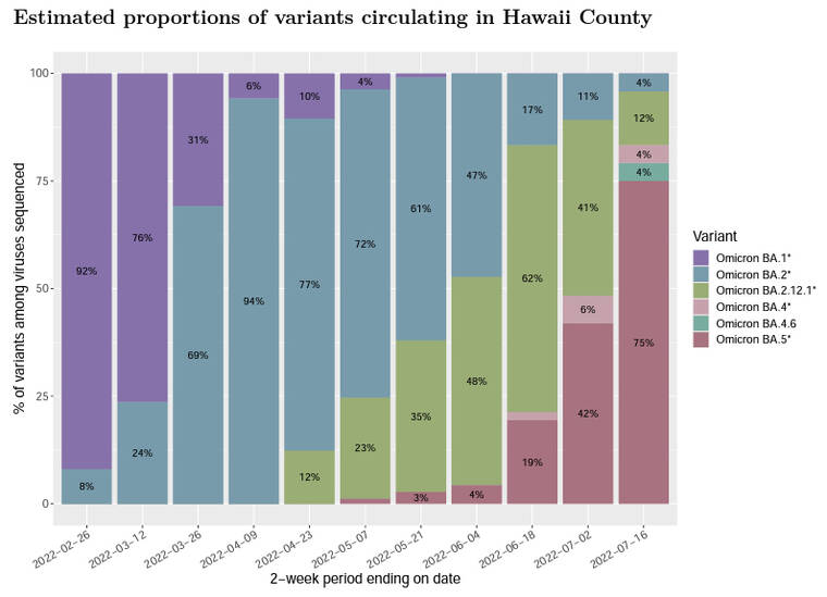 A variant report released by the DOH on Wednesday shows BA.5 accounts for 75% of cases circulating in Hawaii County and 68% of those circulating throughout the state.