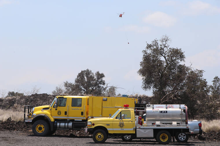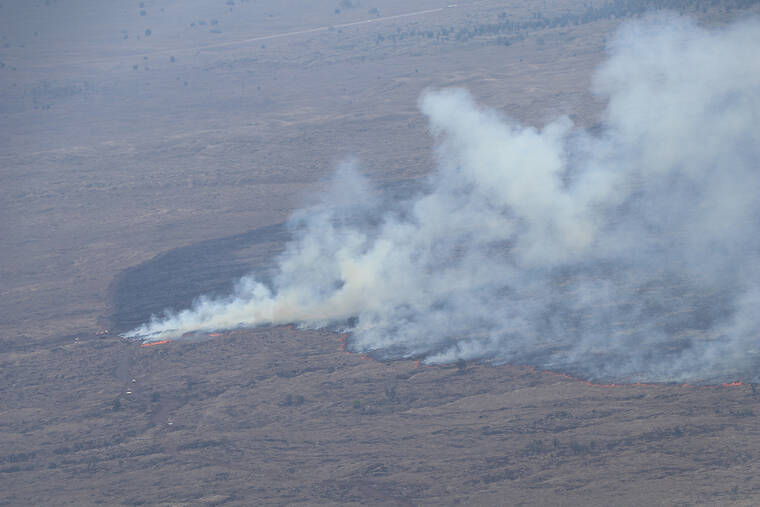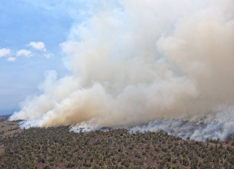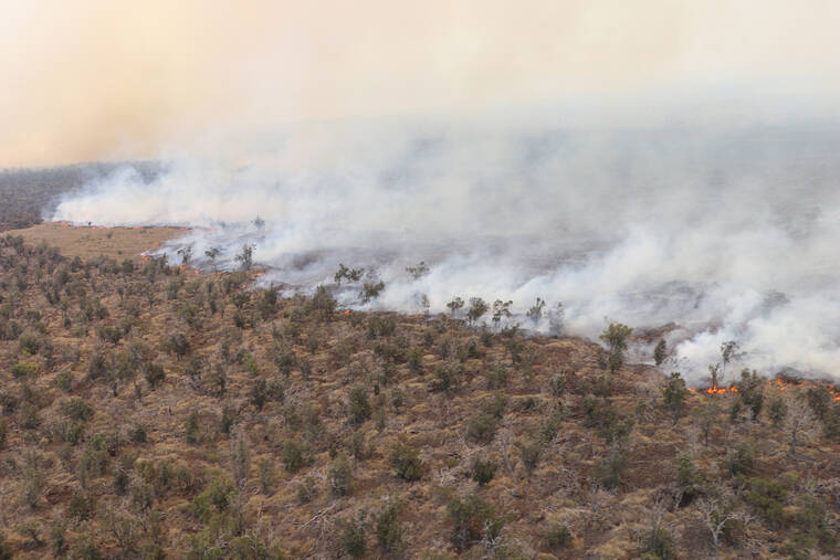 The flames, which firefighters said topped 40 feet, were visible throughout the night from areas across South Kohala. Hawaii Fire Department Chief Kazuo Todd said Thursday evening that personnel had “good control” of the makai edge of the fire, adding that the flames remained a mile above Highway 190. The fire, at that time, was burning in a southerly direction toward the 1859 lava flow and uphill toward Pohakuloa Training Area.