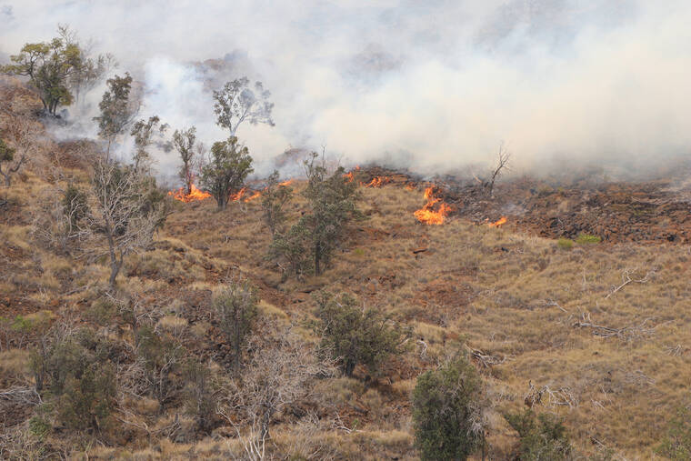 No homes or structures were threatened as of press-time Thursday by the fire, which quickly grew from a flare-up Wednesday of an old blaze within the western portion of the U.S. Army’s Pohakuloa Training Area. According to officials, the fire had been smoldering in the area for several weeks, and high winds amid a red flag warning on Wednesday whipped up the flames.