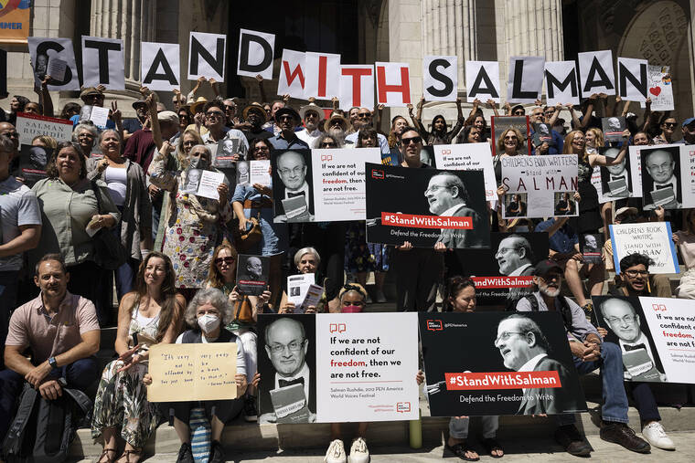 NEW YORK — Friends and fellow authors spoke out on Salman Rushdie’s behalf during a rally Friday on the steps of the main branch of the New York Public Library, one week after he was attacked onstage in the western part of the state and hospitalized with stab wounds.