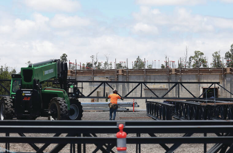 Kelsey Walling/Tribune-Herald A worker holds onto a steel structure Tuesday at the site of the new Emergency Call Center in Hilo.