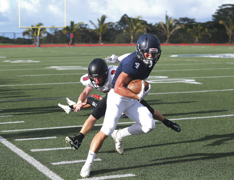 Michael Perry led Kamehameha’s aerial attack, completing 12 of 20 passes for three touchdowns and 201 yards. Snyder was Perry’s favorite target, hauling in seven passes for 75 yards.