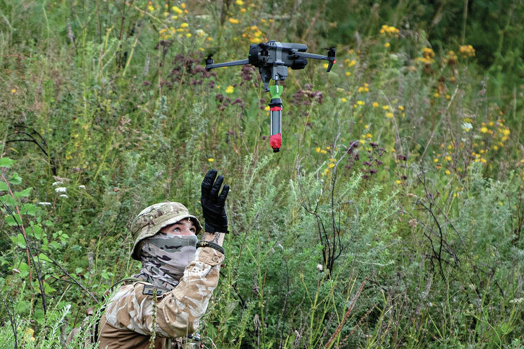 KYIV, Ukraine — Kneeling in a patch of yellow wildflowers, a Chechen soldier carefully attaches an explosive device to the bottom of a small drone. Seconds later, it is released. It explodes next to two old storefront mannequins set up 200 meters (yards) away, one with a Russian-style military hat on its head.