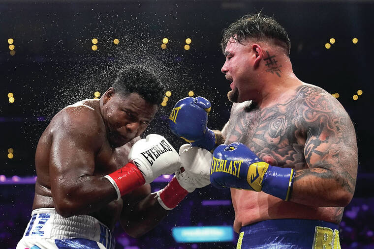 After entering the ring in a blue-and-gold robe and trunks featuring the Super Bowl champion Los Angeles Rams’ colors and helmet horns, Ruiz abruptly floored Ortiz early in the second round with a short right hand. Ortiz wobbled to his feet and soon slipped back down while trying to clinch with Ruiz, but he made it to the bell.