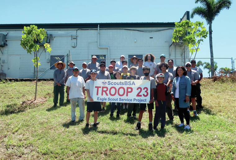 Fifteen Boy Scouts of Troop 23 planted six native kukui trees at Bayfront soccer fields to replace an old Chinese banyan tree. The Eagle Scout project was initiated by both the East Hawaii Outdoor Circle and Hawaii County’s Department of Parks and Recreation.