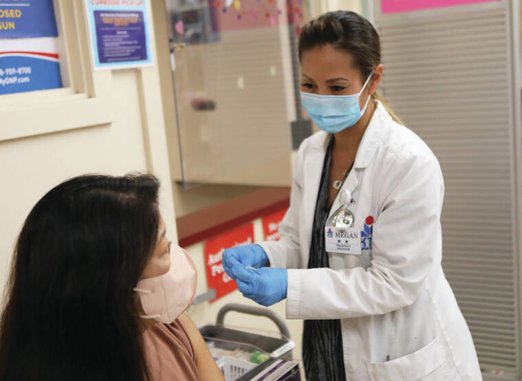 Kelsey Walling/Tribune-Herald Pharmacist Megan Paik Arbles gives information before administering a bivalent COVID-19 vaccine to a woman Wednesday at KTA Super Stores Puainako in Hilo.