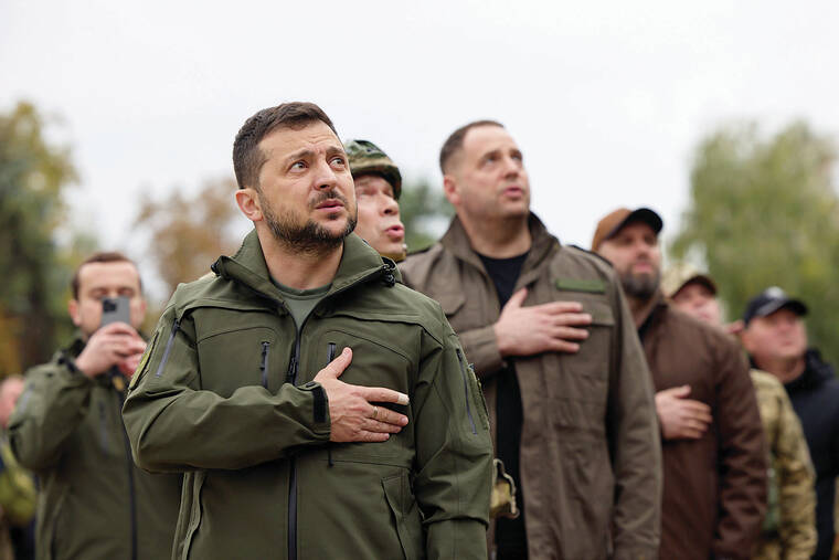 IZIUM, Ukraine — Hand on heart, Ukrainian President Volodymyr Zelenskyy watched his country’s flag rise Wednesday above the recaptured city of Izium, making a rare foray outside the capital that highlights Moscow’s embarrassing retreat from a Ukrainian counteroffensive.