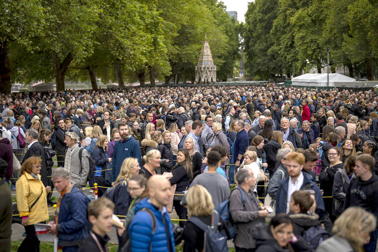 LONDON — Thousands of mourners waited for hours Thursday in a line that stretched for almost 5 miles (8 kilometers) across London for the chance to spend a few minutes filing past Queen Elizabeth II’s coffin while she lies in state. King Charles III spent the day in private to reflect on his first week on the throne.