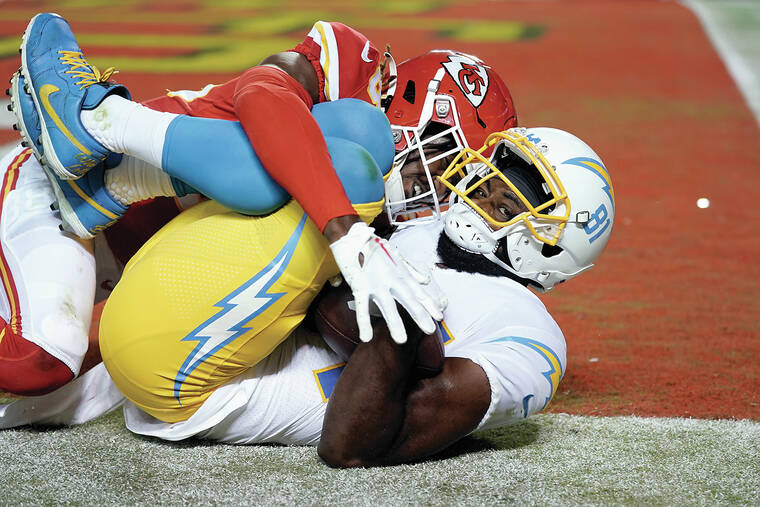 The Chargers fared better offensively, even though go-for-broke coach Brandon Staley opted to play conservatively, twice punting on fourth-and-2 near midfield. Dustin Hopkins kicked an early field goal before Mike Williams, dominating smaller Chiefs defensive backs, put the Chargers in position for Zander Horvath to catch a short TD pass.