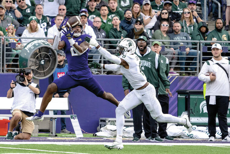 Payton Thorne threw for 323 yards and three TDs, and led a pair of quick fourth-quarter scoring drives for Michigan State that caused some nerves for the Huskies. Thorne threw a 33-yard TD to Keon Coleman with 5:17 left and the 2-point conversion pulled Michigan State within 11. But the rally was too late for the Spartans (2-1), who were stymied in the run game and saw their pass defense get exposed.