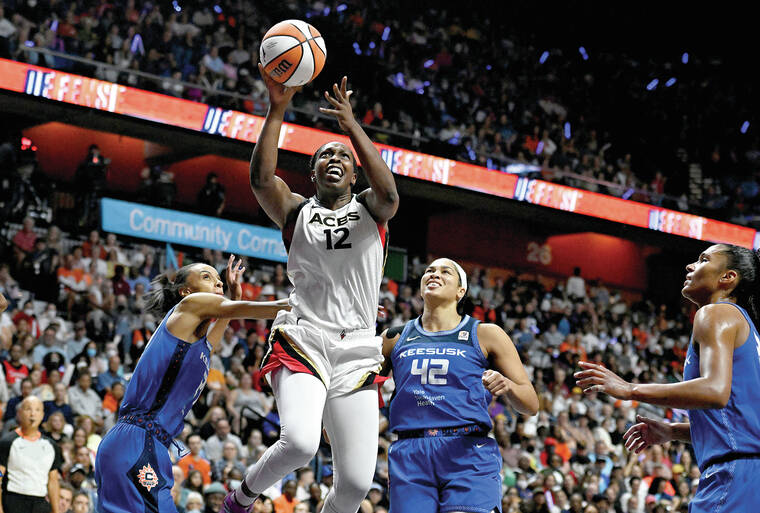Aces owner Mark Davis, who also owns the NFL’s Las Vegas Raiders, wasn’t with his football team Sunday. He was in Connecticut to get a trophy. He hoisted it, then turned it over to gleeful players who did the same.