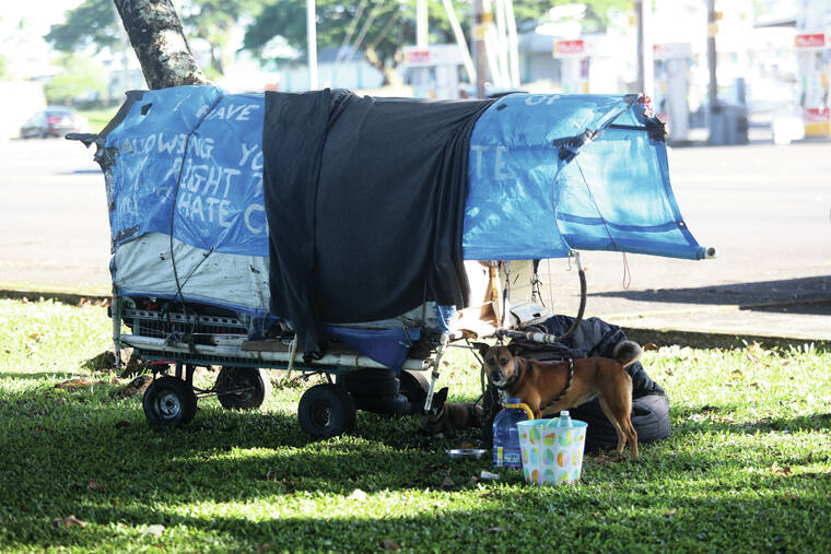 Kelsey Walling/Tribune-Herald A dog looks up from a cart owned by an apparent homeless person in downtown Hilo on Tuesday.