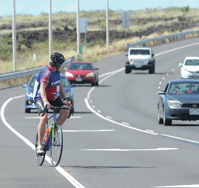 A cyclist checks for traffic before changing lanes on Queen Kaahumanu Highway in 2018. (Laura Ruminski/West Hawaii Today)