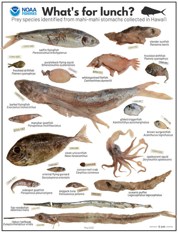 “From the 180 stomachs processed to date, preliminary results have shown that the majority of prey items found in mahimahi stomachs are juvenile stages of reef-associated animals, such as goatfish and surgeonfish,” Kamikawa said.