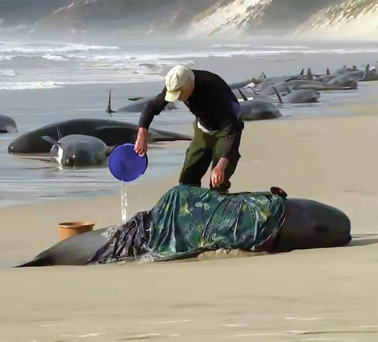 HOBART, Australia (AP) — A day after 230 whales were found stranded on the wild and remote west coast of Australia’s island state of Tasmania, only 35 were still alive despite rescue efforts that were to continue Thursday.