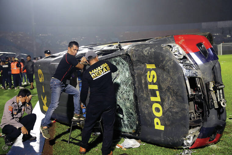 MALANG, Indonesia — Police firing tear gas after an Indonesian soccer match in an attempt to stop violence triggered a disastrous crush of fans making a panicked, chaotic run for the exits, leaving at least 125 people dead, most of them trampled upon or suffocated.