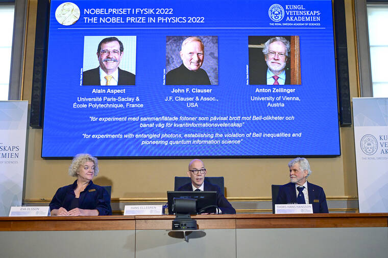 Frenchman Alain Aspect, American John F. Clauser and Austrian Anton Zeilinger were cited by the Royal Swedish Academy of Sciences for experiments proving the “totally crazy” field of quantum entanglements to be all too real. They demonstrated that unseen particles, such as photons, can be linked, or “entangled,” with each other even when they are separated by large distances.