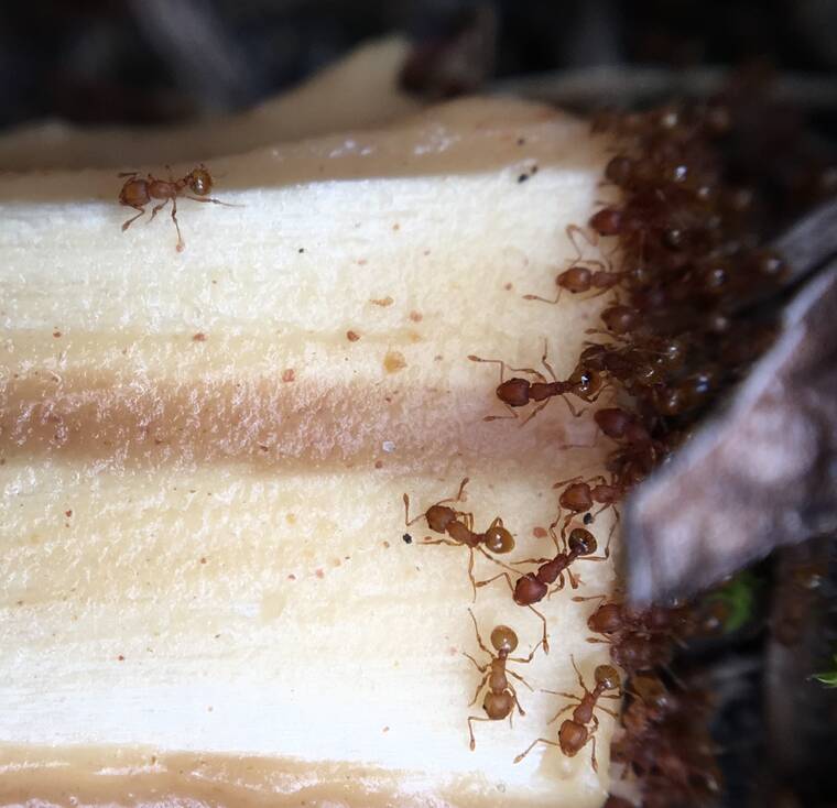 To take an ant sample, Forester said you should smear peanut butter on a chopstick or Popsicle stick and leave it around plants for about an hour or so. Then, place the stick into a sealable bag and freeze it overnight before mailing it or delivering it to Hawaii Ant Lab, 16 E. Lanikaula St., Hilo, HI 96720.