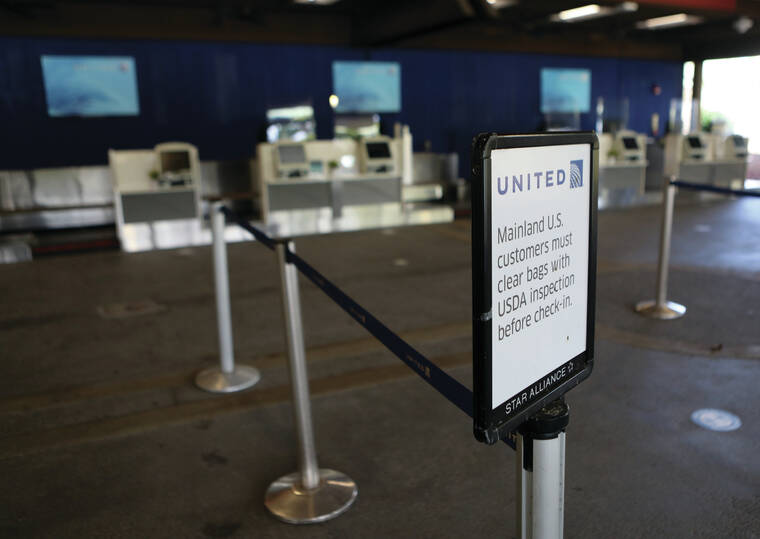 Kelsey Walling/Tribune-Herald A sign at the United Airlines ticket booth at the Hilo airport instructs travelers to have their bags checked by the USDA.