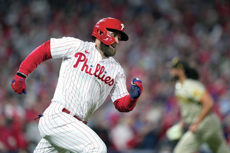 PHILADELPHIA — Bryce Harper stood on second base after a go-ahead double and ran his hands across the script “Phillies” on his jersey as Citizens Bank Park shook in ecstasy over a World Series that suddenly seemed oh-so-close.