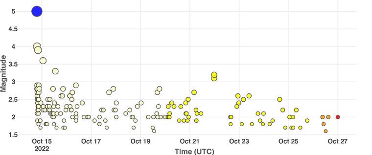 Much about earthquakes is unpredictable but we do know that earthquakes are followed by additional earthquakes, called aftershocks. For instance, in the 10 days after the magnitude 5 earthquake near Pahala on Oct. 14, there have been 6 magnitude aftershocks magnitude 3 and greater, and over 100 magnitude 2 and greater aftershocks within 6.2 miles (10 km). While most aftershocks are smaller than the mainshock, they can still be damaging or deadly and feeling many smaller earthquakes can cause emotional distress. But 5% of earthquakes are followed by a larger earthquake, in which case the earlier earthquakes are referred to as foreshocks and the new largest one becomes the mainshock.