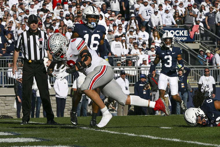 STATE COLLEGE, Pa. (AP) — For the final act in a spectacular performance, J.T. Tuimoloau kept a blocker from cutting his legs, reached up and grabbed a pass intended for a receiver a few yards behind him and casually cruised into the end zone to seal an Ohio State victory.