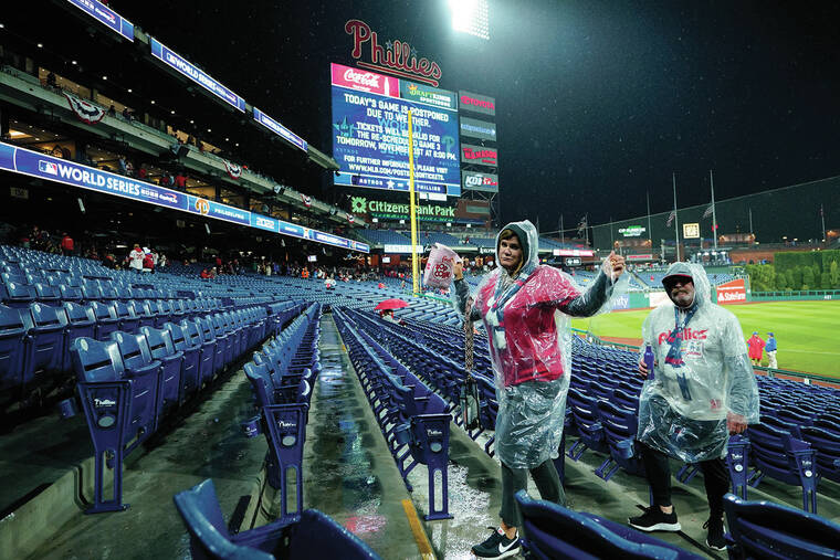 The rainout moved Game 3 to today at Citizens Bank Park, when the weather was supposed to be all clear and first lady Jill Biden had planned to attend Game 4. There was a smattering of boos at the ballpark when the washout was announced an hour before the scheduled first pitch on Halloween night.