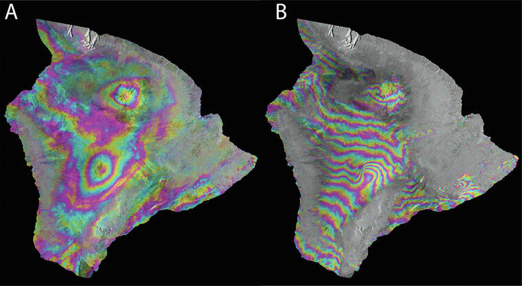 At first glance, the left image (A) could seem to show both Mauna Kea and Mauna Loa inflating at the same rate simultaneously. However, we know from our Global Positioning System instruments that Mauna Kea shows no evidence for significant deformation, so scientists can conclude that the InSAR signals on Mauna Loa are mostly likely unreliable in this specific instance.