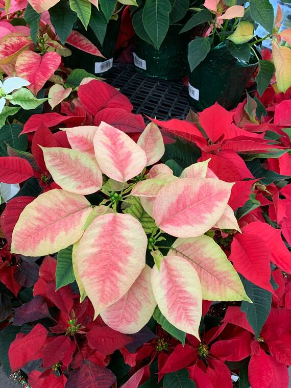 There are a number of poinsettias available. They come in traditional reds or you can enjoy color combinations indoors and in the garden if you mingle the red plantings with white and pink varieties. Since poinsettias give color from now through March, mixing plants in the garden will brighten things up for more than just the holiday season.