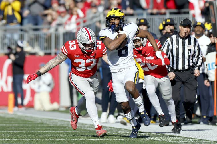 COLUMBUS, Ohio — After Michigan beat Ohio State with stunning ease for the second straight year, Wolverines defensive back Mike Mike Sainristil grabbed a huge maize and blue flag and rushed with teammates to the block “O” in the middle of the Ohio Stadium turf.