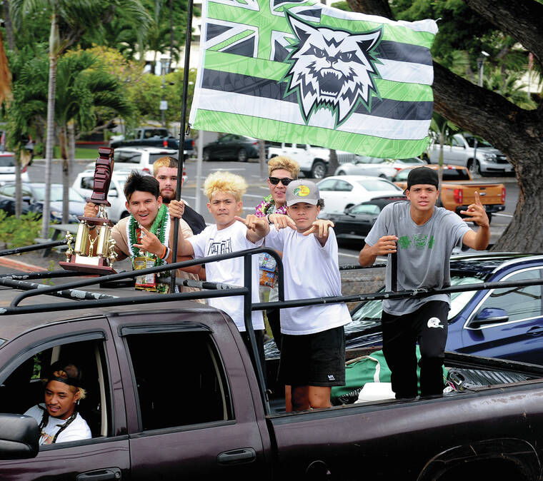 Konawaena Wildcats on a convoy down Alii Drive display their State Championship trophy Sunday morning. (Laura Ruminski/West Hawaii Today)
