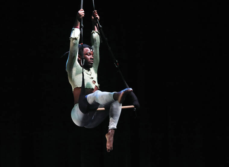Kelsey Walling/Tribune-Herald Zak Pawu rehearses an aerial solo during a dance for the upcoming student showcase "Songs, Scenes and Swirls" at the UH-Hilo Performing Arts Center on Wednesday, Dec. 7, 2022.