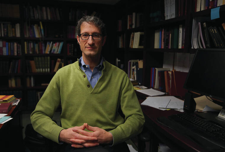 Senior Rabbi Seth Adelson sits for a portrait in his office at Congregation Beth Shalom in the Squirrel Hill neighborhood of Pittsburgh on Tuesday, Dec. 6, 2022. (AP Photo/Jessie Wardarski)