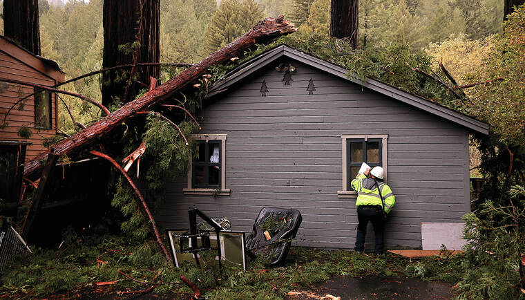 San Francisco Bay Area officials reported power outages and fallen trees, some of which damaged cars and homes. In Monte Rio, a small town along the Russian River in Sonoma County, firefighters responded to several reports of downed trees crashing into homes in 50 mph wind gusts.