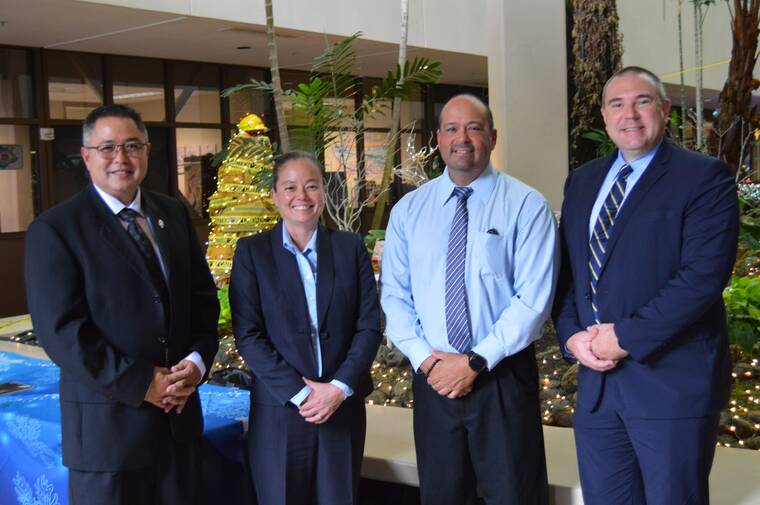 JOHN BURNETT/Tribune-Herald The four finalists for Hawaii Police Department Chief wait in the breezeway of the County Building in Hilo Monday as commissioners meet in executive session. They are, from left: Capt. Paul Applegate of the Kauai Police Department; Maj. Sherry Bird of the Hawaii Police Department; Edward Ignacio, retired senior resident agent of the FBI’s Hawaii office; and Major Benjamin Moszkowicz of the Honolulu Police Department.