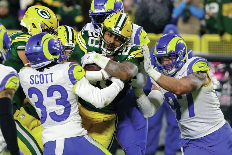 A.J. Dillon ran for two scores, Rodgers threw a touchdown pass to Aaron Jones and the Packers kept their playoff hopes afloat with a 24-12 victory over the Los Angeles Rams on Monday night amid freezing conditions. The temperature was 15 degrees (minus-9 celsius) with a wind chill of 7 just before the opening kickoff.