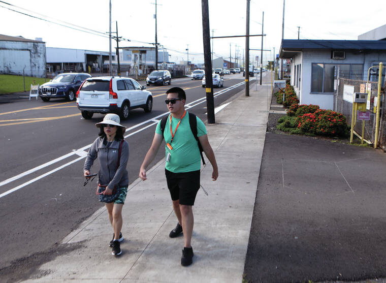 Kelsey Walling/Tribune-Herald Tourists walk down the sidewalk Tuesday next to the newly reopened Kalanianaole Street toward a cruise ship docked at the Port of Hilo.