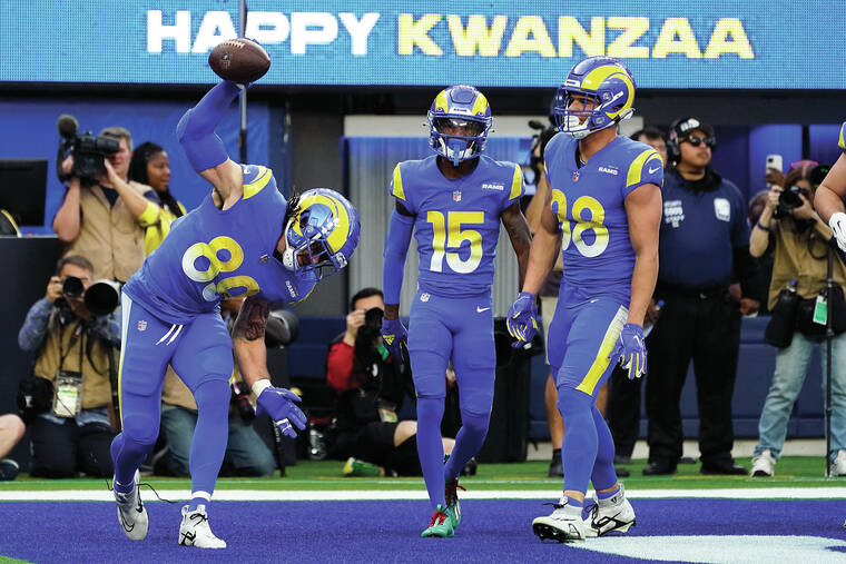 Higbee became the Rams’ career franchise leader in scoring catches by a tight end with his TD catch in the first quarter for his 19th career score. Akers then scored two snaps after Wagner made a long return of his interception across the middle.