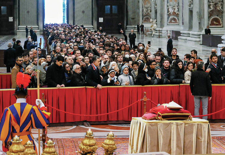 VATICAN CITY — Pope Emeritus Benedict XVI ‘s body, his head resting on a pair of crimson pillows, lay in state in St. Peter’s Basilica on Monday as tens of thousands queued to pay tribute to the pontiff who shocked the world by retiring a decade ago.