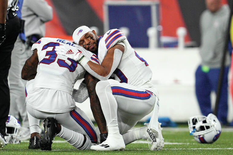 An ambulance was on the field four minutes after Hamlin collapsed, with many players in tears, including cornerback Tre’Davious White. The quarterbacks — Buffalo’s Josh Allen and Cincinnati’s Joe Burrow — embraced.