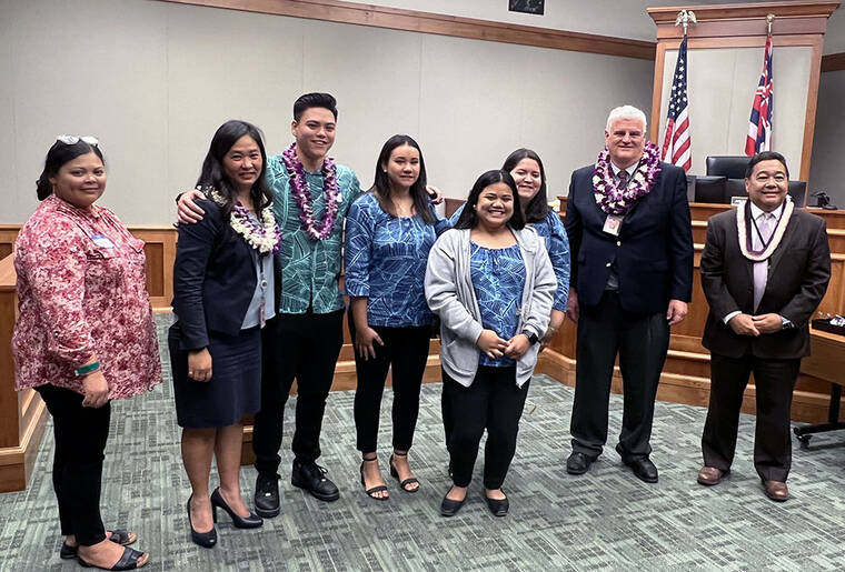 Hawaii Judiciary photo From left, Raquel Gali, Judge Darien Ching Nagata, Kekoa Abellera, Tianna Webster, Precious Ahulau-Kaleo, Melissa Mayo, Chief Justice Mark Recktenwald, and Third Circuit Chief Judge Robert Kim.