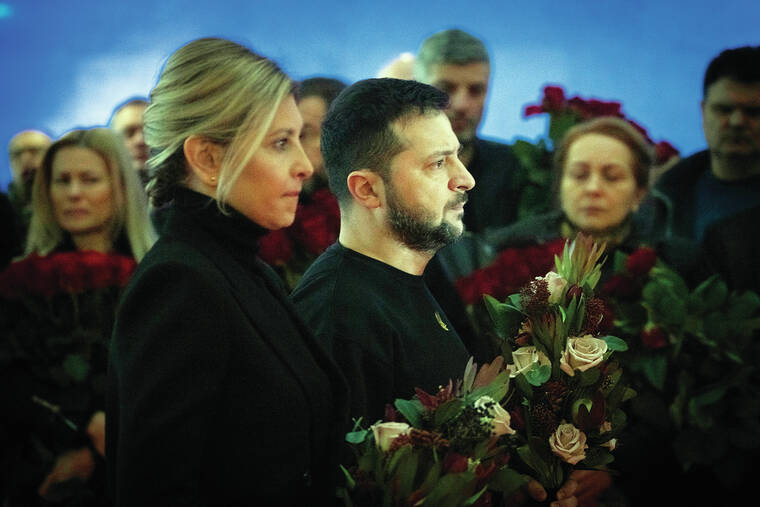 At the somber service in Kyiv, Zelenskyy and his wife laid flowers on each of the seven coffins draped in the blue and yellow flags of Ukraine.