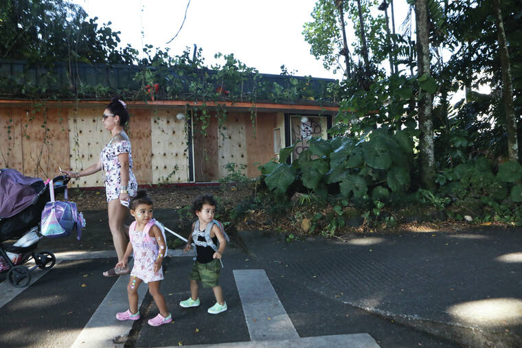 Kelsey Walling/Tribune-Herald Keiki look behind as they walk with their mom in front of Uncle Billy's on Banyan Drive in Hilo on Tuesday, Jan. 24, 2023.