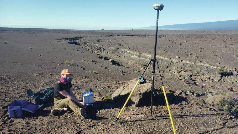If you see three orange-shirted scientists hiking around Kilauea summit this month, carrying a shoebox-sized case and a long pole with a GPS antenna on the top, that’s us! Feel free to stop and say “aloha,” we love to talk about what we’re doing and why.
