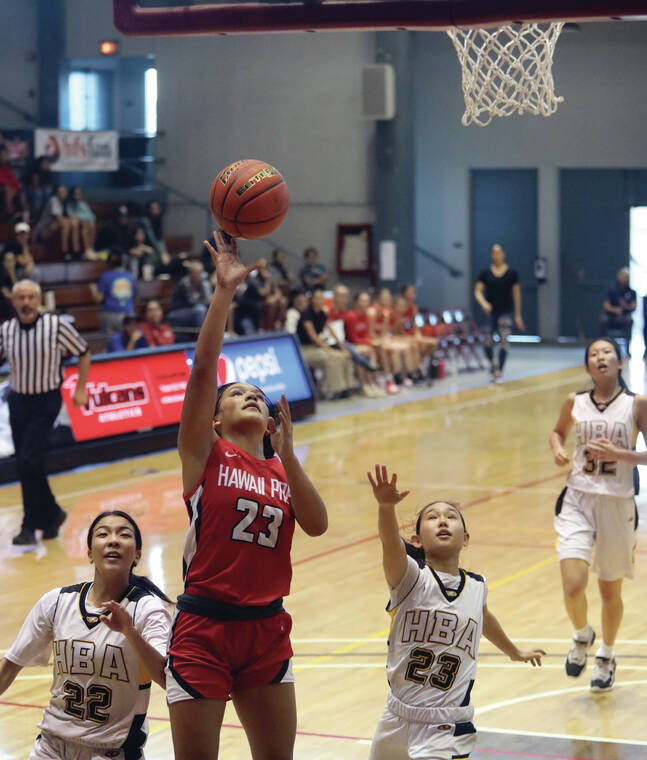 Hawaii Preparatory guard Brooke Samura makes a lay up against Hawaii Baptist during the HHSAA Division II girls basketball quarterfinals on Thursday, Feb. 2, 2023. ▲