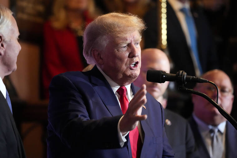 Former President Donald Trump speaks at a campaign event at the South Carolina Statehouse, Saturday, Jan. 28, 2023, in Columbia, S.C. South Carolina Gov. Henry McMaster listens at left. (AP Photo/Alex Brandon)