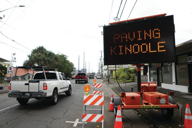 Kelsey Walling/Tribune-Herald Cars drive down Kinoole Street from Waianuenue toward Haili in Hilo on Wednesday, Feb. 8, 2023. Portions of Kinoole will be closed for three weeks for resurfacing.