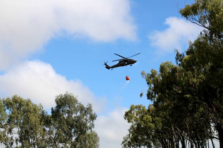 Three U.S. Army military helicopters from the 25th Infantry Division on Oahu continued to conduct water bucket drops Wednesday morning, with 45 drops, totaling almost 38,000 gallons of water.
